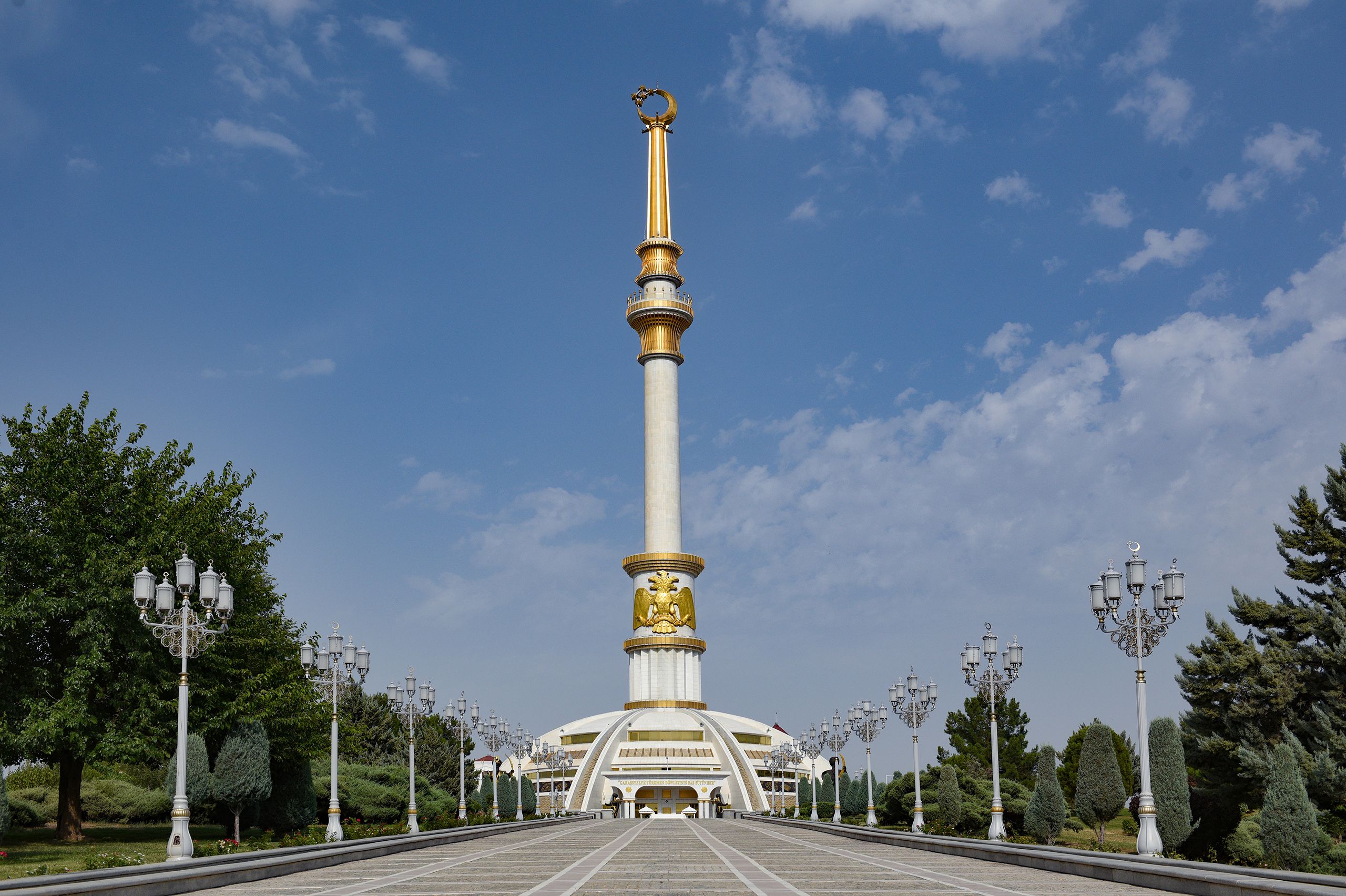 Landmarks on the Ashgabat skyline: the 185m high Constitution Monument, the Monument of Neutrality, and the Ministry of Foreign Affairs of Turkmenistan