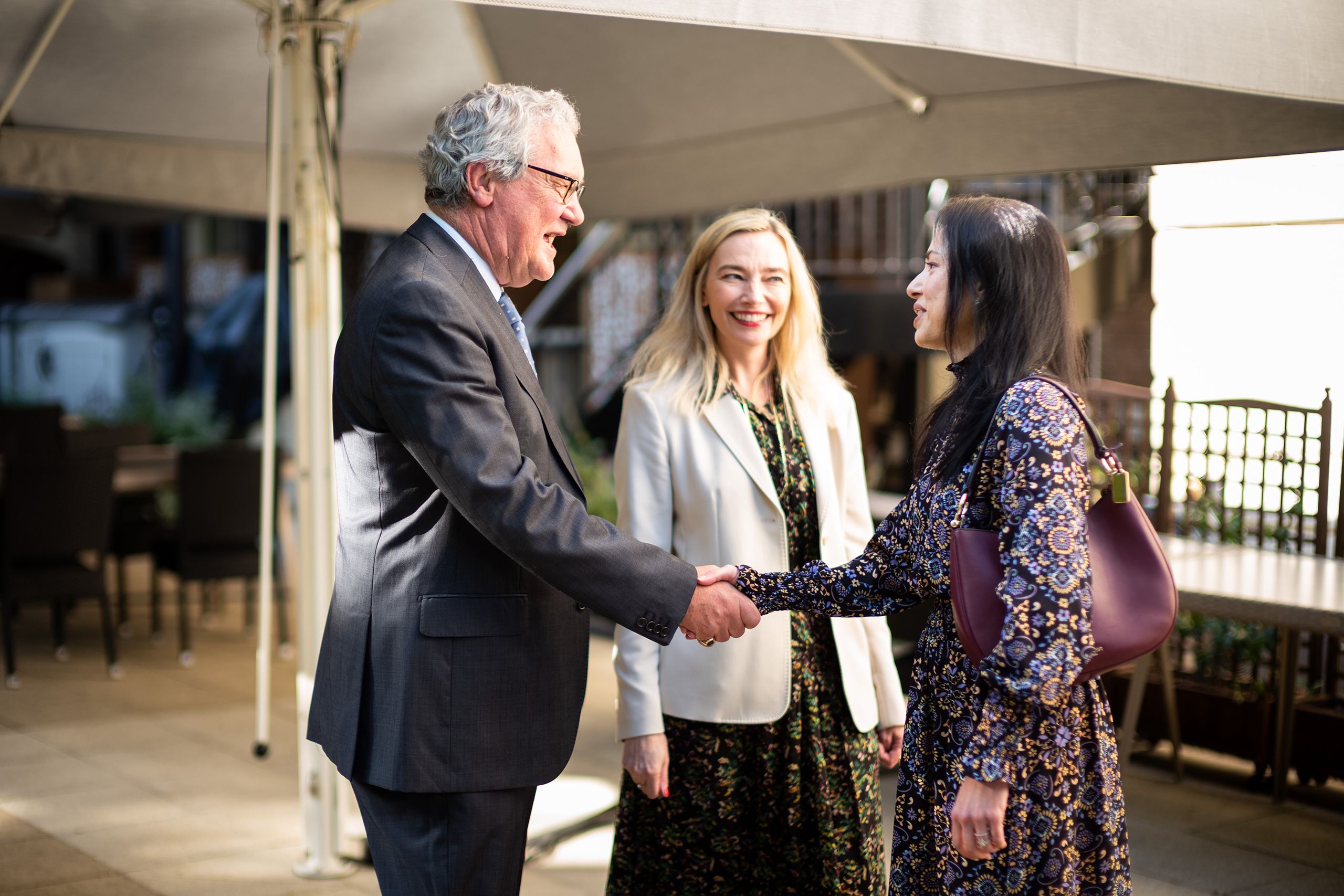 ROSL President The Hon Alexander Downer AC and ROSL Director General Dr Annette Prandzioch greet Agent General for Saskatchewan (UK Office), Ranissah Samah