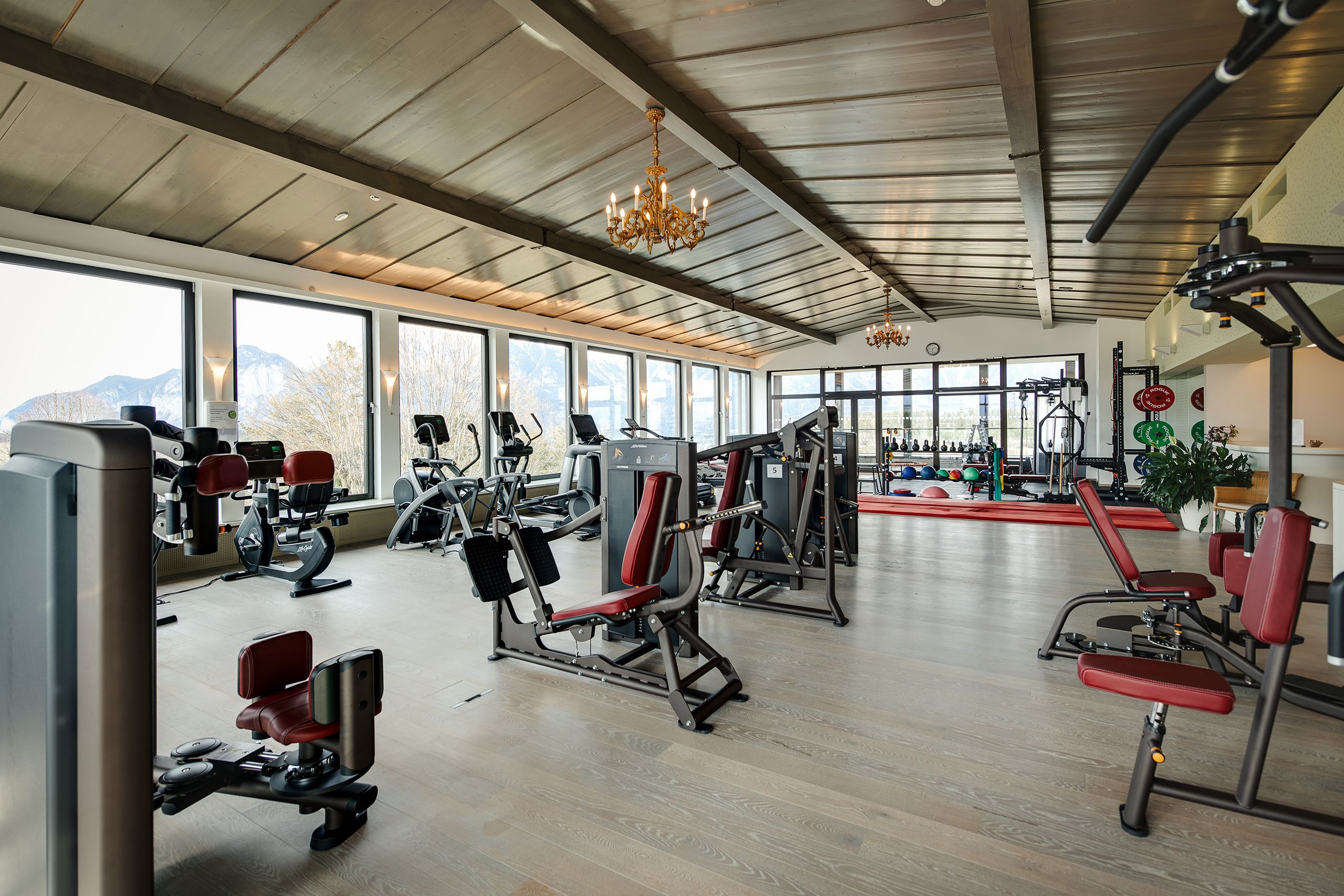 The panoramic gym occupies a penthouse-like space with a vast Alpine view and the latest equipment — plus personal trainers by appointment.